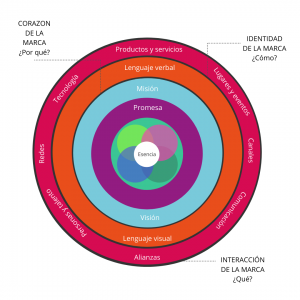 Una marca se compone de varias zonas: en primer lugar está su centro, su identidad, su personalidad. Esto es lo primero que verás en el dibujo… y eso es algo muy importante: son todas aquellas cosas que constituyen su esencia, su personalidad, su corazón, eso que realmente ES. Luego está la zona en la cual establecemos el lenguaje con el cual ella se va a comunicar con los demás, con sus fans, con sus padres, con su entorno… y si es estrella de rock más aún… su voz tiene que ser poderosa, potente, intensa… capaz de comunicar su corazón con el mundo exterior. Esta fue una de las cosas que aprendí con ellas: